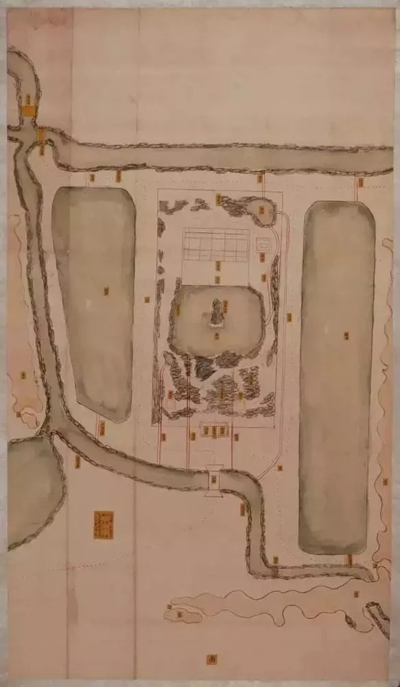上圖為樣式房繪制的皇家藏書館——圓明園文源閣平面圖,圖中細長中空的紅色“管線”,標明為“暗渠”。