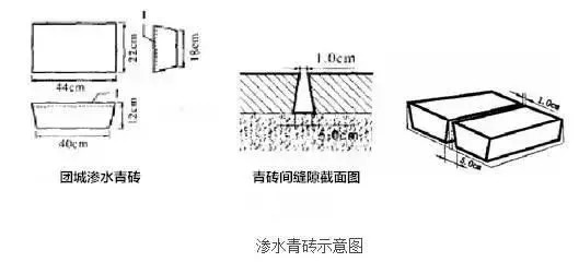 可以看到青磚之間形成一個三角形的縫隙。這樣的造型對排水的幫助是顯而易見的,這些青磚本身滲水透氣性就不錯,雨水透過青磚之間的接口,就進入到地下三角形的縫隙當中。磚縫越向下越開闊,雨水自然不容易停留在表層,而是滲入地下,通過地下水系統(tǒng)緩沖和滲排出去。