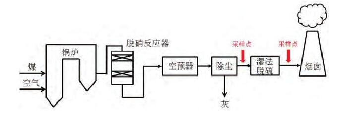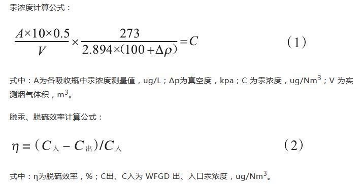 如圖 1 所示,采樣測點分別布置在 WFGD 入口和出口處。測試總汞的含量和煙氣中二氧化硫的濃度,用于判斷增效劑對脫汞和脫硫效率的影響。測試二氧化硫濃度時將煙氣分析儀連接煙道取樣點,調(diào)試好儀器,取三個點分別測試二氧化硫的濃度,將測試結(jié)果進行記錄匯總。測試總汞濃度時,將測試儀器連接就緒,選取 3 個點進行測試,測試結(jié)束后將樣品回收,放入密封瓶內(nèi)保存,等待進一步分析。