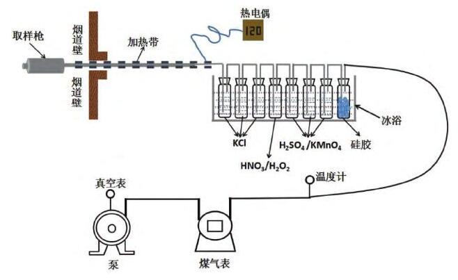 如圖所示,首先,取樣槍在煙道的采樣點等速取樣,煙氣在此處被吸入取樣系統(tǒng)。在取樣槍的前端有石英纖維過濾器,顆粒態(tài)汞在這個地方被捕獲。隨后煙氣流入取樣管,取樣管外包裹有加熱帶,其溫度必須維持在 120 ℃以上,確保取樣管具有一定的溫度,這樣可防止煙氣中的汞在取樣管上凝結(jié)。后面冰浴中的吸收瓶的作用是吸收單質(zhì)汞和氣態(tài)二價汞。二價汞在 1mol/L 的 KCI 溶液中被吸收,而單質(zhì)汞則由5%硝酸+10%過氧化氫溶液和 4%高錳酸鉀+10%硫酸溶液吸收。隨后,待取樣完成對樣品進行復原、消解然后對其中的汞含量進行測定。