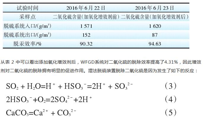表3 氧化增效劑對脫硫系統(tǒng)前后汞濃度的影響