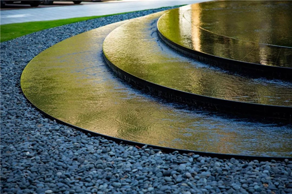 以中心橢圓形鏡面水景為中心,黑色鏡面石材、爐渣、礫石、草帶等材質層層錯位環(huán)繞,形成寬窄變化有致、富有動感的弧形帶狀空間,用不銹鋼條做收邊分割,線條流暢優(yōu)美。