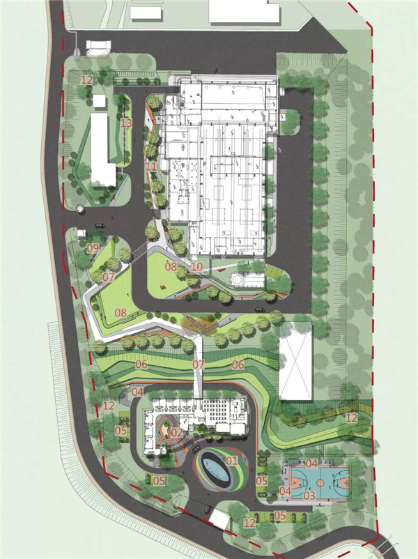 01 入口水景廣場;02 接待庭院; 03 運動廣場; 04 休閑節(jié)點;05 生態(tài)停車位; 06 景觀坡地; 07 景觀廊橋; 08 休閑庭院;09 景觀亭;10 觀景平臺; 11參觀步道; 12 組團綠化; 13 景觀屏風