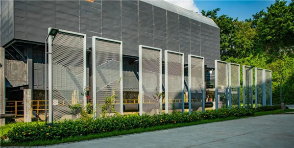 陣列金屬板構架屏蔽冷卻塔不好的視覺感受,形式和材料與廠房建筑立面呼應,穿孔板孔洞大小圖案變化勾勒出起伏的山巒,這道時尚的景觀屏風與周圍環(huán)境融為一體。