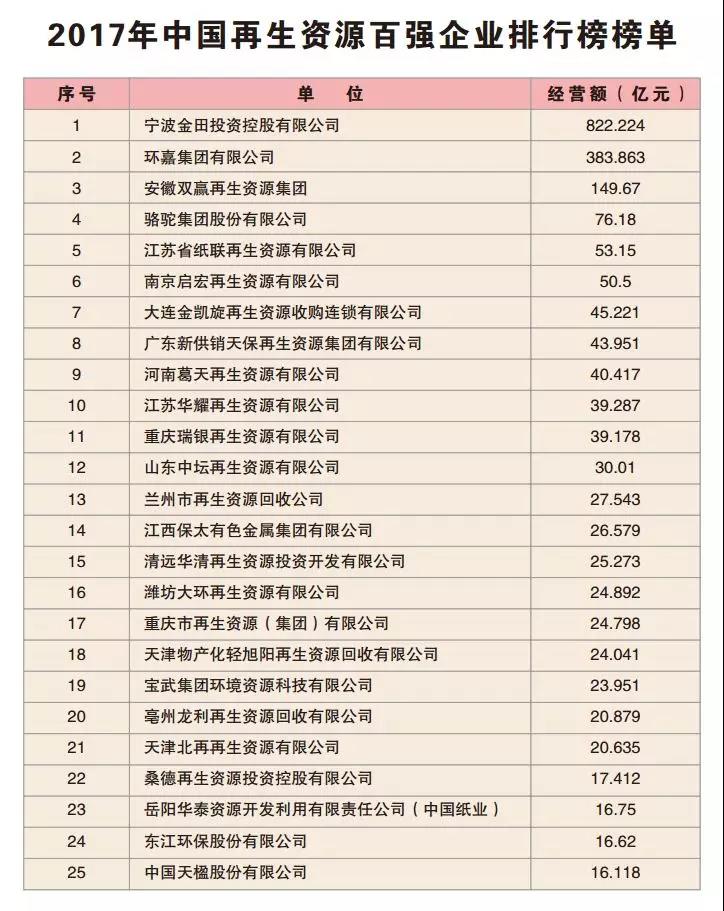 原標(biāo)題:官宣!2017中國再生資源百強企業(yè)經(jīng)營狀況調(diào)查報告!附百強企業(yè)排行榜單新鮮出爐!
