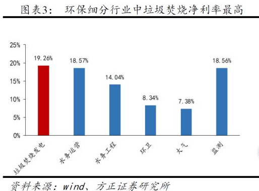 凈利率方面,2017年垃圾焚燒發(fā)電行業(yè)整體凈利率19.26%,高于其他細(xì)分行業(yè)。