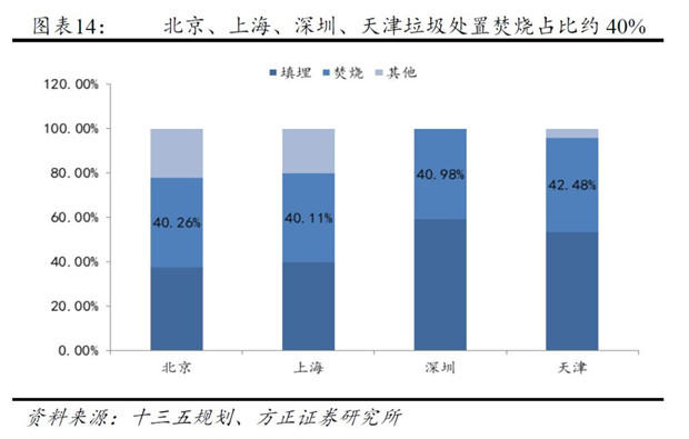 而從北京、上海、深圳、天津等大城市的生活垃圾處置能力來看,目前焚燒占比約40%,隨著早期填埋場(chǎng)的滿產(chǎn)及土地資源的稀缺,大型城市生活垃圾焚燒處置將是大勢(shì)所趨。