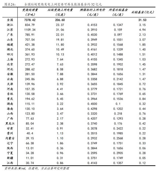 按照2016年各省垃圾焚燒處置量,噸垃圾上網(wǎng)電量280度測(cè)算,全國垃圾焚燒發(fā)電上網(wǎng)需要可再生能源基金約32億元。