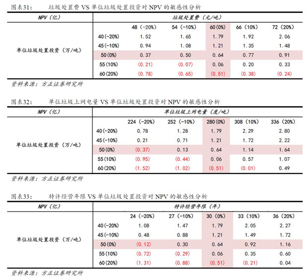 通過敏感性測(cè)試,項(xiàng)目NPV影響因素由大到小依次為:?jiǎn)挝煌顿Y額>單位垃圾上網(wǎng)電量>特許經(jīng)營期限>垃圾處置費(fèi)。單位投資額對(duì)于項(xiàng)目NPV影響最大,建設(shè)期成本管控對(duì)于項(xiàng)目整體估值影響最大;其次為單位垃圾上網(wǎng)電量,受到垃圾熱值、焚燒設(shè)備效率、自用電比例等因素影響;其次為特許經(jīng)營年限;最后為垃圾處置費(fèi)。