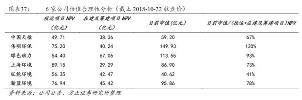我們整理6家上市公司的已投運(yùn)項(xiàng)目,通過計(jì)算單個(gè)項(xiàng)目NPV加總,得到目前6家上市公司的已投運(yùn)項(xiàng)目的現(xiàn)金流折現(xiàn)價(jià)值。