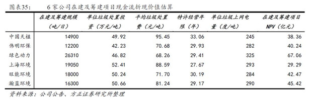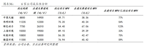 通過在建及籌建項(xiàng)目NPV/已投運(yùn)項(xiàng)目NPV的指標(biāo)來表現(xiàn)公司成長性,成長性由高到低依次為:綠色動(dòng)力、中國天楹、旺能環(huán)境、偉明環(huán)保、瀚藍(lán)環(huán)境、上海環(huán)境。