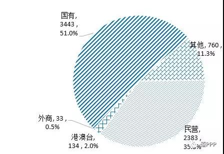 社會資本合作方類型。4,089個落地項目中社會資本所有制信息完善的項目共4,018個,涉及社會資本共6,753家,包括民營2,383家、港澳臺134家、外商33家、國有3,443家,另有類型不易辨別的其他760家,民營企業(yè)占比35.3%,如圖1-6-1。