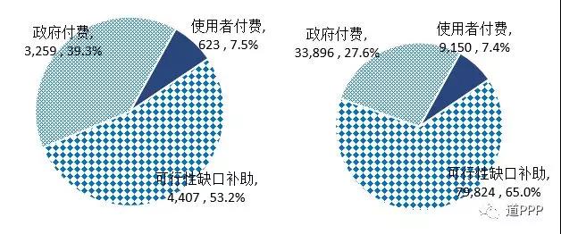 管理庫累計使用者付費類項目623個、投資額9,150億元,分別占管理庫的7.5%和7.4%;累計可行性缺口補助(即政府市場混合付費)類項目4,407個、投資額8.0萬億元,分別占管理庫的53.2%和65.0%;累計政府付費類項目3,259個、投資額3.4萬億元,分別占管理庫的39.3%和27.6%,具體如圖1-11-3和1-11-4。