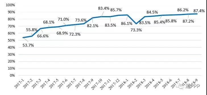 三季度落地示范項目凈減項目1個、投資額946億元,項目數(shù)、投資額下滑緣于落地示范項目退庫。截至2018年三季度,落地示范項目累計865個、投資額1.9萬億元,落地率87.4%,無移交階段項目。示范項目總體落地率變化如圖2-2-1。