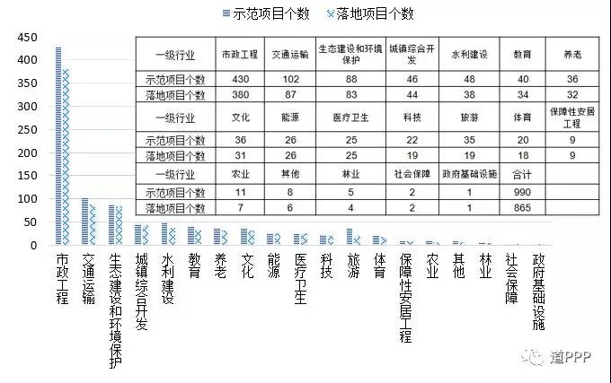 865個落地示范項目中,市政工程類380個,占43.9%;交通運輸類87個,占10.1%;生態(tài)建設和環(huán)境保護類83個,占9.6%;其他各類共315個,占36.4%。三季度落地示范項目行業(yè)分布如圖2-3-1,各行業(yè)示范項目數(shù)與落地數(shù)對比如圖2-3-2。