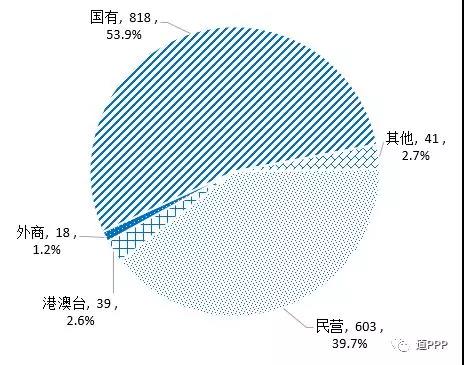 社會資本合作方類型。865個落地示范項目中包括446個獨家社會資本項目和419個聯(lián)合體項目。簽約社會資本共1,519家,包括民營603家、港澳臺39家、外商18家、國有818家,另有類型不易辨別的其他41家。如圖2-5-1,民營企業(yè)占比39.7%,環(huán)比上升0.3個百分點。