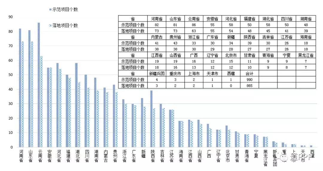 按各地落地示范項目數(shù)統(tǒng)計,河南和山東(含青島)已有73個示范項目簽約進入執(zhí)行階段,并列居全國第一;其后云南63個、安徽55個、河北54個。其余各省均不足50個。各地示范項目數(shù)與落地數(shù)對比如圖2-4。