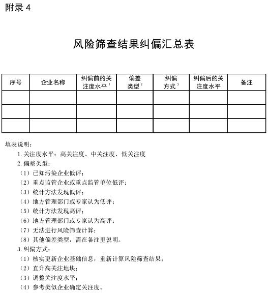 地方環(huán)保部門應(yīng)組織有關(guān)單位按照風(fēng)險篩查結(jié)果糾偏意見,進(jìn)行問題整改。技術(shù)支持單位應(yīng)填寫風(fēng)險篩查結(jié)果糾偏匯總表(附錄4),并連同專家論證會意見、糾偏專家信息表(附錄 5)、調(diào)整后的企業(yè)用地關(guān)注度劃分標(biāo)準(zhǔn)(附錄 6)上傳到詳查數(shù)據(jù)庫。風(fēng)險篩查結(jié)果糾偏匯總表及專家論證會意見應(yīng)加蓋地方環(huán)保部門公章。