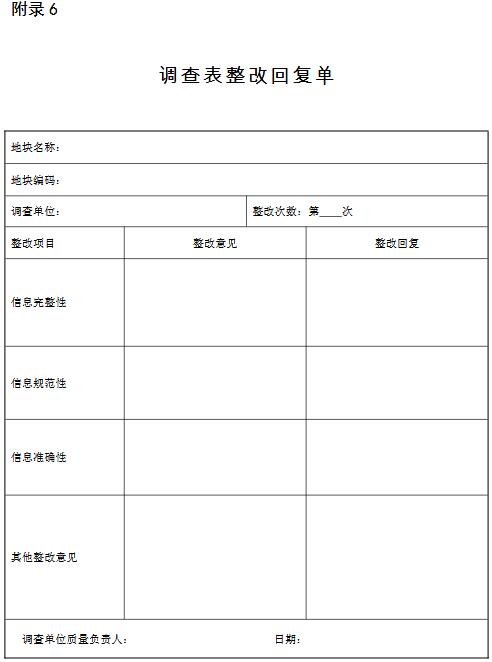 注: a:信息完整性檢查:若帶“*”的未填項數(shù)超過 2 個或不帶“*”的未填項數(shù)超過 5 個,則判定為信息完整性檢查不合格;b:信息規(guī)范性檢查:若帶“*”的不規(guī)范填報項數(shù)超過 2 個或不帶“*”的不規(guī)范填報項數(shù)超過 5 個,則判定為信息規(guī)范性檢查不合格;c:信息準(zhǔn)確性檢查:當(dāng)*項不準(zhǔn)確填報項數(shù)超過 2 個,則判定為信息準(zhǔn)確性檢查不合格;d:調(diào)查表填報質(zhì)量評價:完整性、規(guī)范性、準(zhǔn)確性三者有一項不合格則判定該地塊調(diào)查表填報為不合格;若三項均合格,統(tǒng)計調(diào)查表中帶“*”的未填信息項、不規(guī)范信息項和不準(zhǔn)確信息項總數(shù),超過 5 個則判定為調(diào)查表填報質(zhì)量不合格。對不合格調(diào)查表需出具整改意見單。