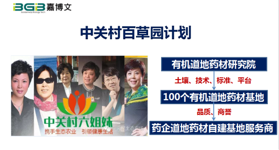 接下來,講一下中關(guān)村百草園的案例。在國際中藥材市場,中國的中藥占有率不到0.2%,日、韓是85%,他們在國際市場的中藥多是在中國種植的,但標(biāo)準(zhǔn)不一樣,關(guān)鍵就是高碳低氮健康土壤的培育。于是,我們在中關(guān)村發(fā)起了一個百草園計劃,成立了有機道地藥材研究院,用中醫(yī)思想解決中藥問題,其中最主要的就是有機質(zhì)安全、高效、標(biāo)準(zhǔn)化利用,標(biāo)準(zhǔn)化農(nóng)時管理。我們和北師大北中醫(yī)國家大學(xué)科技園等機構(gòu)共同成立這個研究院,作為一個平臺,這也是中關(guān)村六姐妹們共同為有機中藥做的一個平臺,建立100個有機道地藥材研究基地,它的第一個服務(wù)對象是中關(guān)村的生物制藥企業(yè),我們將在國家貧困縣做100個有機道地藥材項目,成為藥企自有藥材基地的運營服務(wù)商。