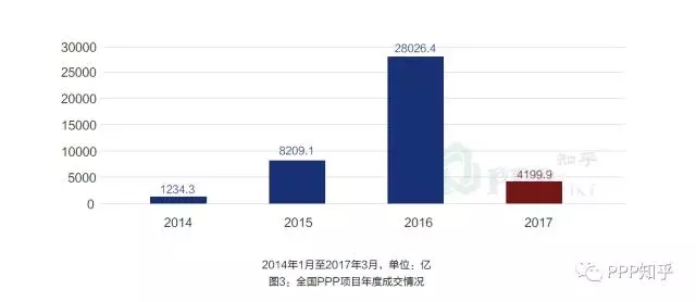 而中國自2014年以來,根據(jù)PPP知乎和龍元明城的市場成交月報數(shù)據(jù),截止2017年3月31日,大約3年的時間成交項目總數(shù)就達到了2579個,累計金額達到了4.17萬億元,并呈現(xiàn)了明顯的逐年加速態(tài)勢(參見《2017年3月全國PPP項目市場動態(tài)》)。