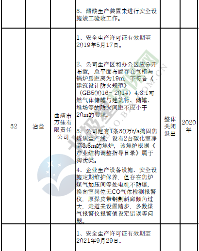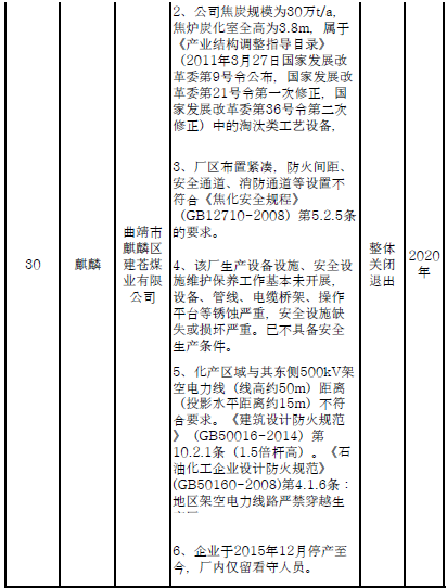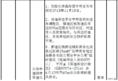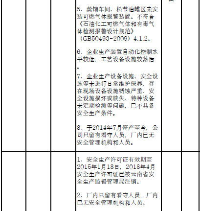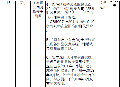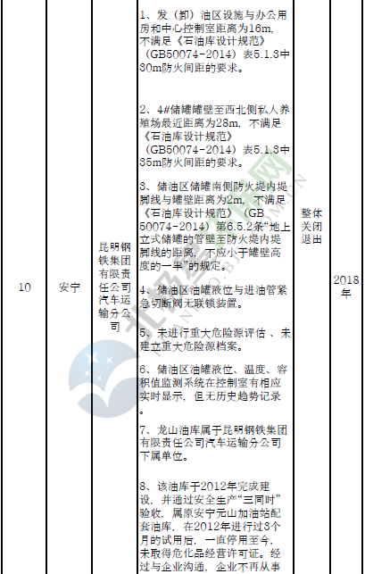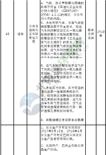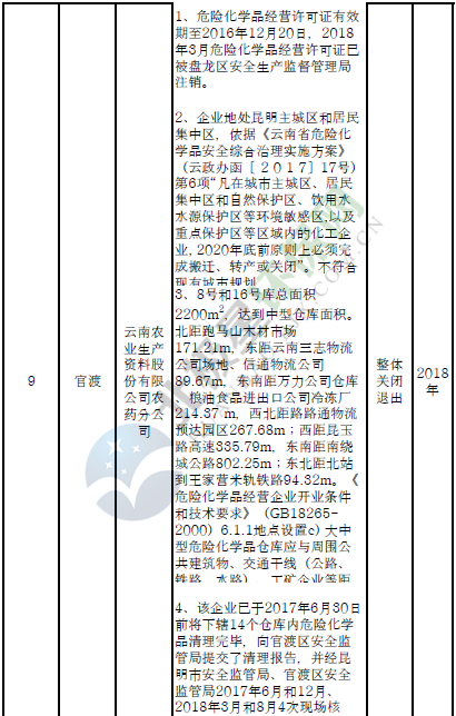 四、對8戶(詳見附件3)位于人員密集區(qū)、安全距離不足、工藝技術(shù)落后、存在重大隱患的危險化學(xué)品生產(chǎn)(儲存)企業(yè)進(jìn)行綜合整治,2020年底前全部完成,各相關(guān)企業(yè)具體完成時間由各州市政府結(jié)合本地實際確定。各州市政府要統(tǒng)籌制定重大隱患綜合整治方案,做到“一企一方案”并報省安委會辦公室。其中:昆明市2戶,曲靖市1戶,玉溪市1戶,楚雄州1戶,文山州1戶,西雙版納州1戶,大理州1戶。