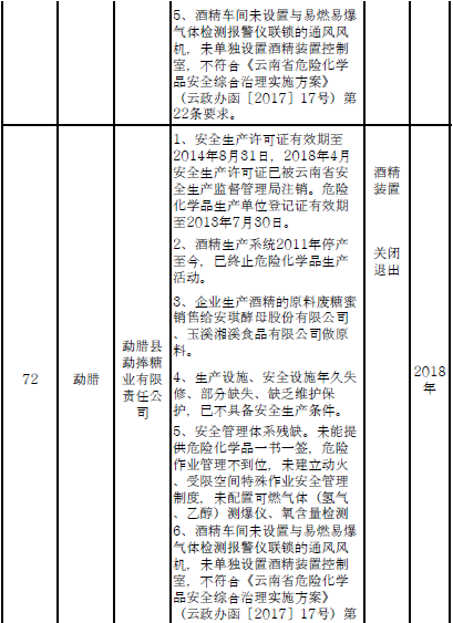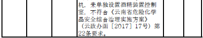 三、對37戶(詳見附件2)內(nèi)部安全距離不足、工藝技術(shù)和裝備水平低的危險化學(xué)品企業(yè)實施就地改造。其中:昆明市9戶,曲靖市5戶,玉溪市2戶,保山市1戶,楚雄州2戶,普洱市11戶,西雙版納州2戶,大理州1戶,德宏州1戶,怒江州1戶,臨滄市2戶。