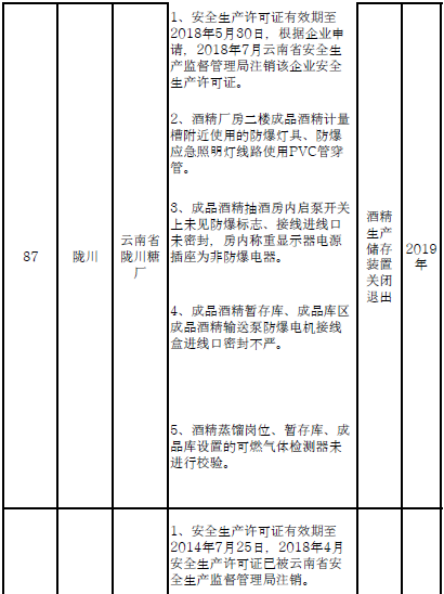 2019年10月底完成自動化控制和安全儀表系統(tǒng)改造升級工作。2019年10月底,未單獨設(shè)置控制室的乙醇生產(chǎn)企業(yè)按照規(guī)程要求完成改造,酒精生產(chǎn)車間的易燃易爆氣體檢測報警儀與通風(fēng)風(fēng)機(jī)實現(xiàn)聯(lián)鎖。除關(guān)閉退出、就地改造、重大隱患整治等企業(yè)外,其它危險化學(xué)品生產(chǎn)(儲存)企業(yè)列入整治提升,2020年底前完成。