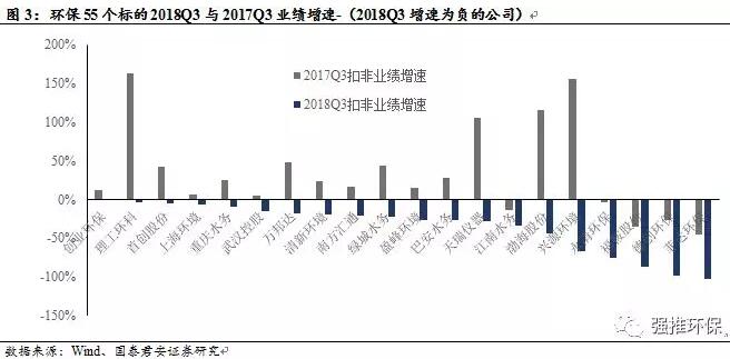 2018前三季度環(huán)保行業(yè)整體①營業(yè)收入1073億元,同比增長(zhǎng)23%,增速同比回落6pct,Q3單季收入391億元,同比增15%;②前三季度環(huán)保板塊實(shí)現(xiàn)扣非凈利潤(rùn)131億元,同比增7%,增速同比回落26pct,Q3單季扣非凈利潤(rùn)50億元,同比增1%,增速回落29pct。③各子板塊的扣非凈利潤(rùn)增速顯著回落。Q3單季扣非凈利潤(rùn)增速,監(jiān)測(cè)(+33%)、固廢處置(+15%)與危廢處置(+9%)板塊維持穩(wěn)健增長(zhǎng)。