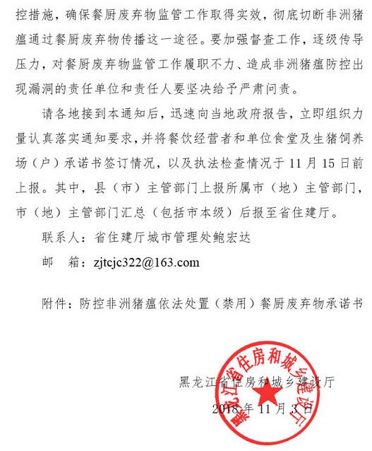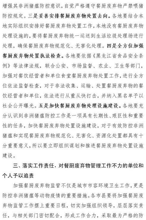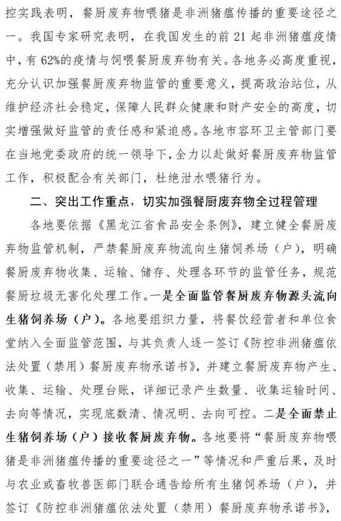日前,黑龍江住建廳發(fā)布了關(guān)于防控非洲豬瘟加強(qiáng)餐廚廢棄物管理工作的緊急通知,《通知》指出,目前,全國和我省非洲豬瘟防控工作形勢十分嚴(yán)峻。國際非洲豬瘟防控實踐表明,餐廚廢棄物喂豬是非洲豬瘟傳播的重要途徑之一。各地要杜絕泔水喂豬,依據(jù)《黑龍江省食品安全條例》,建立健全餐廚廢棄物監(jiān)管機(jī)制,將餐飲經(jīng)營者和單位食堂納入全面監(jiān)管范圍,與其負(fù)責(zé)人逐一簽訂承諾書,并建立餐廚廢棄物產(chǎn)生、收集、運(yùn)輸、處理臺賬,實現(xiàn)底數(shù)清、情況明、去向可控。全面禁止生豬飼養(yǎng)場(戶)接收餐廚廢棄物。