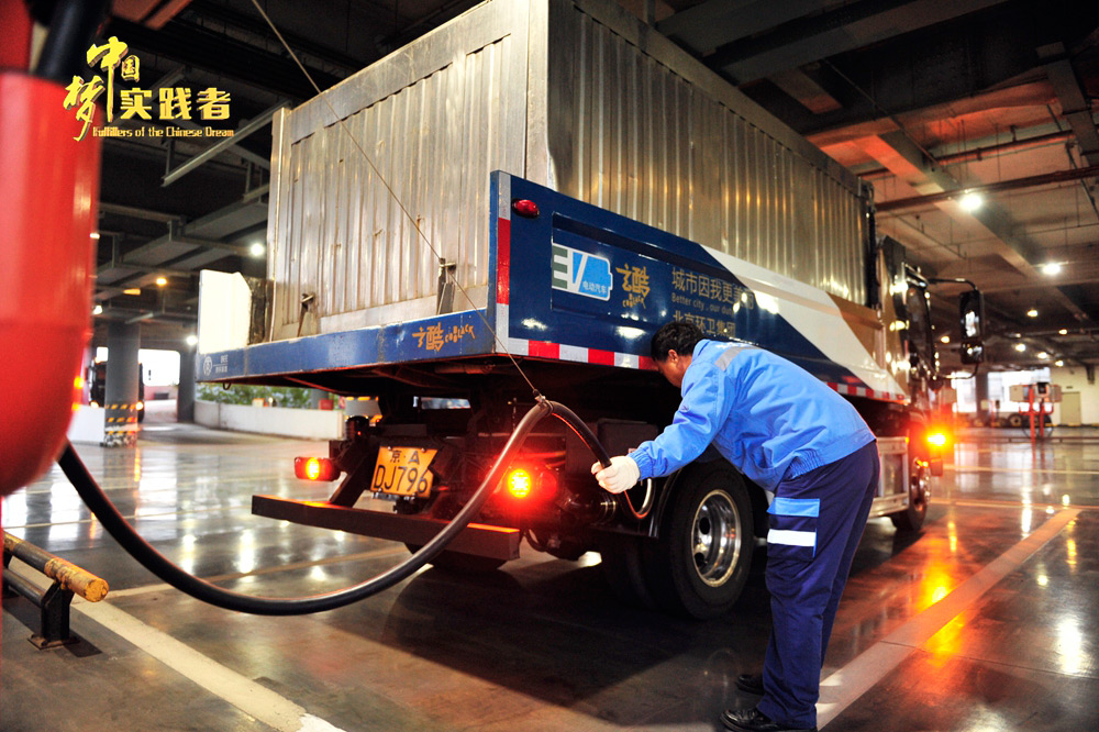王師傅與同事們平時擔負著北京西城區(qū)內(nèi)50.7平方公里53個垃圾站的垃圾和糞便清運任務,每天4至5趟的清運任務,日行程近150公里,清運垃圾15噸。