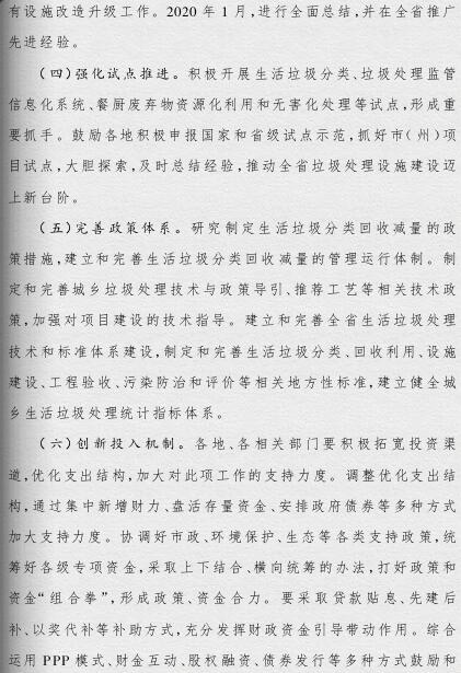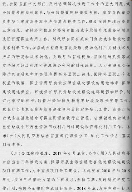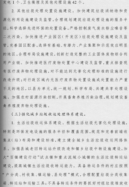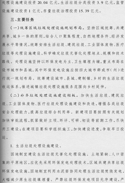 《方案》提出,要根據(jù)人口聚集程度、自然地理條件、經濟發(fā)展水平等情況統(tǒng)籌規(guī)劃布局垃圾處理設施建設;要補齊垃圾處理設施建設短板,到2019年底,新建生活垃圾無害化處理設施76座,完成無害化處理設施改擴建43個和存量垃圾治理項目62個。