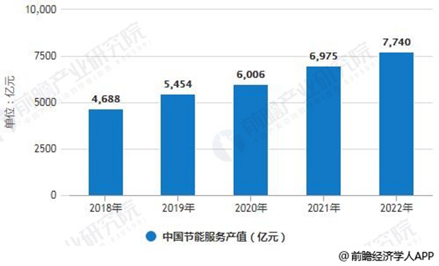 據(jù)前瞻產(chǎn)業(yè)研究院發(fā)布的《節(jié)能服務(wù)行業(yè)市場(chǎng)前瞻與投資戰(zhàn)略規(guī)劃分析報(bào)告》統(tǒng)計(jì)數(shù)據(jù)顯示,2017年中國(guó)節(jié)能服務(wù)產(chǎn)業(yè)產(chǎn)值達(dá)4148億元,全國(guó)從事節(jié)能服務(wù)的企業(yè)6137家,行業(yè)從業(yè)人數(shù)68.5萬(wàn)人,合同能源管理投資形成年節(jié)能能力超過(guò)3800萬(wàn)噸標(biāo)準(zhǔn)煤,年減排二氧化碳突破1億噸,節(jié)能服務(wù)產(chǎn)業(yè)繼續(xù)保持了良好發(fā)展勢(shì)頭。預(yù)計(jì)2018年我國(guó)節(jié)能服務(wù)業(yè)總產(chǎn)值將達(dá)到4688億元,未來(lái)五年(2018-2022)年均復(fù)合增長(zhǎng)率約為13.35%,預(yù)測(cè)到了2022年我國(guó)節(jié)能服務(wù)業(yè)總產(chǎn)值將達(dá)到7740億元。