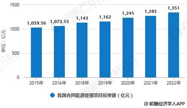 2015年,我國(guó)合同能源管理項(xiàng)目投資額為1039.56億元,同比增長(zhǎng)8.43%。到了2016年我國(guó)合同能源管理項(xiàng)目投資額為1073.55億元,同比增長(zhǎng)3.27%。綜合以上因素,預(yù)計(jì)2018年我國(guó)合同能源管理項(xiàng)目投資額將達(dá)到1143億元,未來(lái)五年(2018-2022)年均復(fù)合增長(zhǎng)率約為4.26%,預(yù)測(cè)到了2022年我國(guó)合同能源管理項(xiàng)目投資額將達(dá)到1351億元。