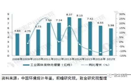 圖表:2008-2017年中國工業(yè)固體廢物處置量及增長情況