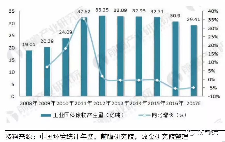 圖表:2008-2017年中國工業(yè)固體廢物產(chǎn)生量及增長情況