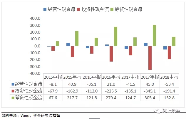 現(xiàn)金流方面,2018年上半年行業(yè)整體經(jīng)營性現(xiàn)金流為-53億元,較上年同期大幅減少12億元;籌資性凈現(xiàn)金流132億元,較去年同期增長8億元;上半年投資性凈現(xiàn)金流為-191億元,經(jīng)營與籌資凈現(xiàn)金流量難以彌補(bǔ)投資凈現(xiàn)金流出,并呈現(xiàn)出逐年惡化的趨勢,行業(yè)整體現(xiàn)金流情況依然堪憂。
