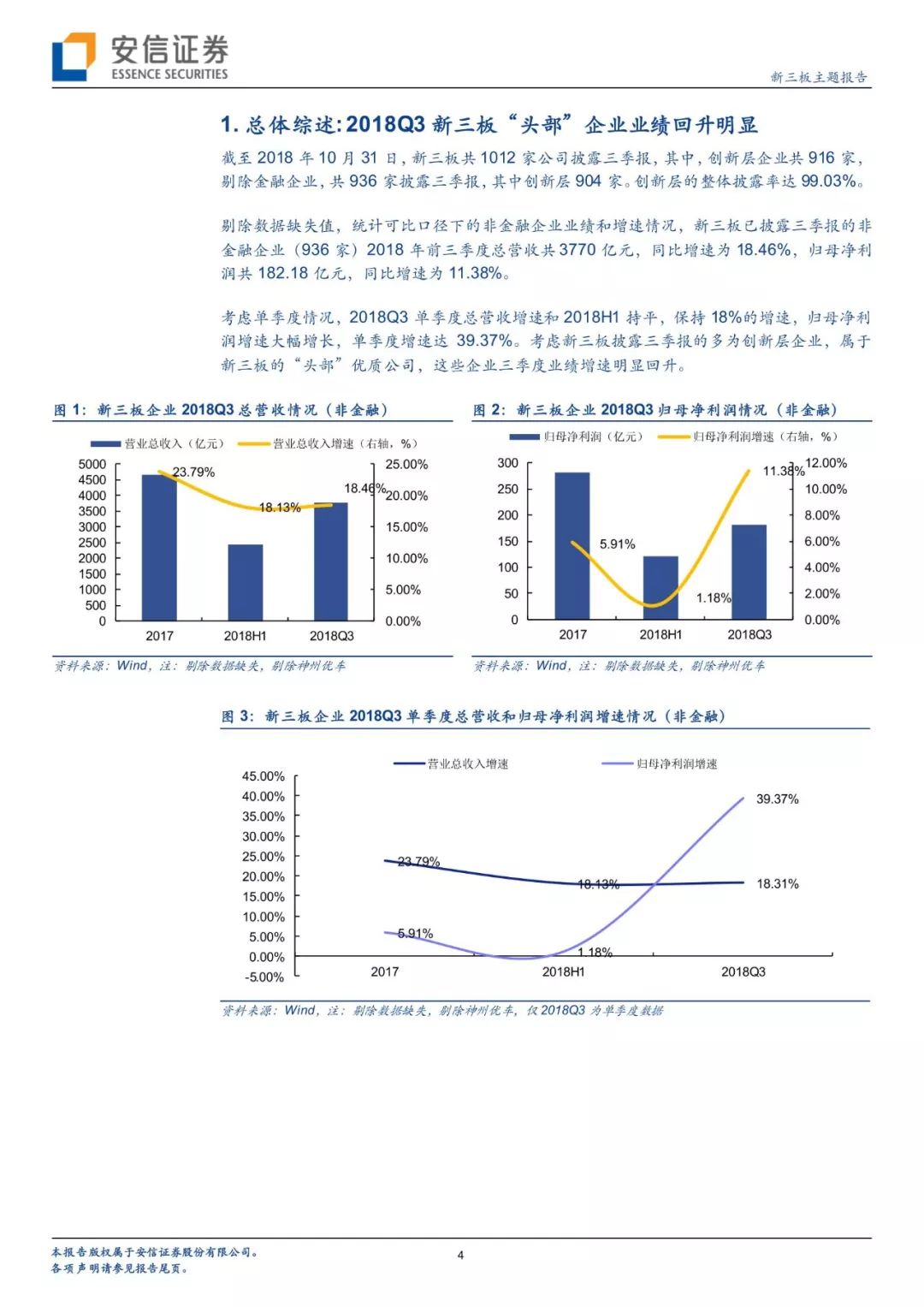 截至2018年10月31日,新三板共1012家公司披露三季報(bào),創(chuàng)新層企業(yè)共916家,剔除金融企業(yè),共936家披露三季報(bào)(創(chuàng)新層904家)。剔除數(shù)據(jù)缺失值,可比口徑下的非金融企業(yè)(936家)2018年前三季度總營(yíng)收共3770億元,同比增速為18.46%,歸母凈利潤(rùn)共182.18億元,同比增速為11.38%。2018Q3單季度總營(yíng)收增速和2018H1持平,保持18%的增速,歸母凈利潤(rùn)增速大幅增長(zhǎng),單季度增速達(dá)39.37%。主要原因是創(chuàng)新層企業(yè)屬于新三板的“頭部”優(yōu)質(zhì)公司,這些企業(yè)三季度業(yè)績(jī)?cè)鏊倜黠@回升。