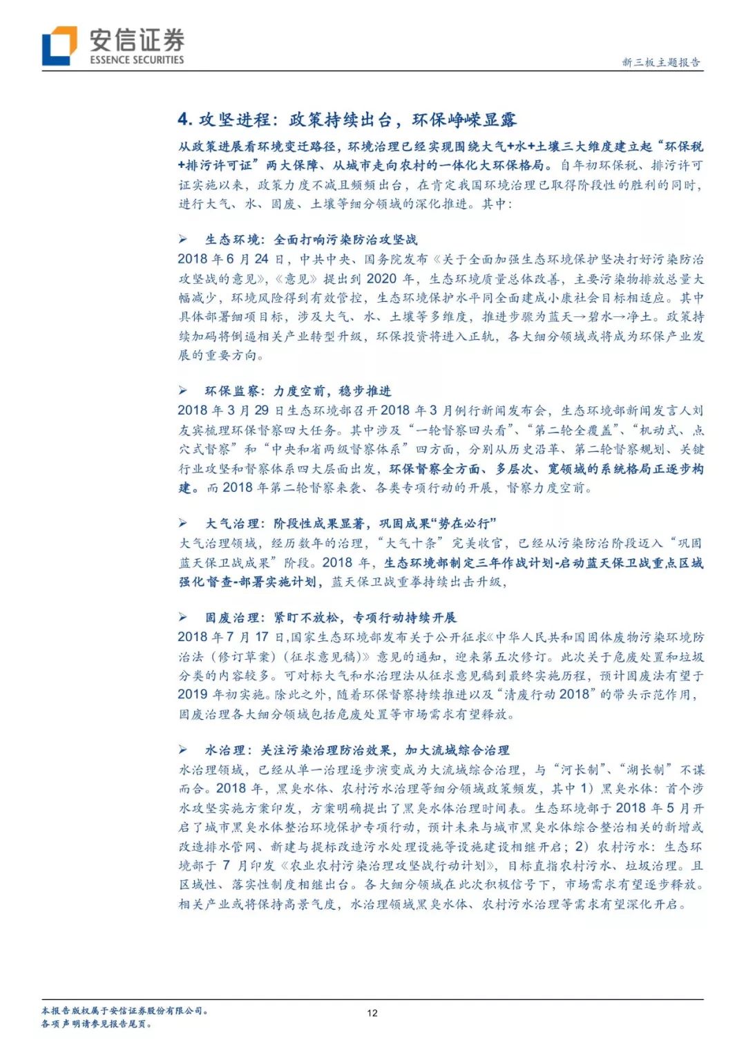 從政策進(jìn)展看環(huán)境變遷路徑,環(huán)境治理已經(jīng)實(shí)現(xiàn)圍繞大氣+水+土壤三大維度建立起“環(huán)保稅+排污許可證”兩大保障、從城市走向農(nóng)村的一體化大環(huán)保格局。自年初環(huán)保稅、排污許可證實(shí)施以來,政策力度不減且頻頻出臺(tái),在肯定我國(guó)環(huán)境治理已取得階段性的勝利的同時(shí),進(jìn)行大氣、水、固廢、土壤等細(xì)分領(lǐng)域的深化推進(jìn)。我們對(duì)于2018年以來各細(xì)分板塊政策及變遷進(jìn)行了梳理。而新三板擁有400家公司,覆蓋了大氣治理、水治理、固廢治理等各個(gè)領(lǐng)域。我們繼續(xù)看好環(huán)保板塊,建議從政策推進(jìn)進(jìn)程中發(fā)掘潛在機(jī)會(huì),建議關(guān)注水治理、固廢治理和再生資源板塊投資機(jī)會(huì)。