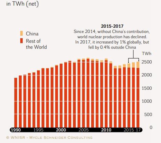然而,如果將中國排除在統(tǒng)計數(shù)據(jù)外,結(jié)果會截然不同,報告顯示如果這樣計算,全球核電發(fā)電量會出現(xiàn)連續(xù)第三年下降。