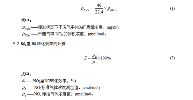 氮氧化物(NOx)濃度等于一氧化氮(NO)與二氧化氮(NO2)轉(zhuǎn)化得到的NO濃度之和。按下式計(jì)算標(biāo)準(zhǔn)狀態(tài)(273 K, 101.325 kPa)下廢氣中的NOx質(zhì)量濃度,結(jié)果以NO2計(jì):