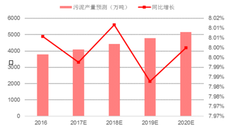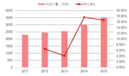 根據(jù)報(bào)告,2015 年我國(guó)城鎮(zhèn)污泥年產(chǎn)量達(dá)到 3500 萬(wàn)噸,較 2014 年同比增長(zhǎng) 16%。據(jù)中國(guó)產(chǎn)業(yè)信息網(wǎng)的測(cè)算,未來(lái)幾年我國(guó)污泥產(chǎn)生量將逐年穩(wěn)步增加,預(yù)計(jì)年增長(zhǎng)率為 8%左右, 2020 年達(dá)到5157 萬(wàn)噸。