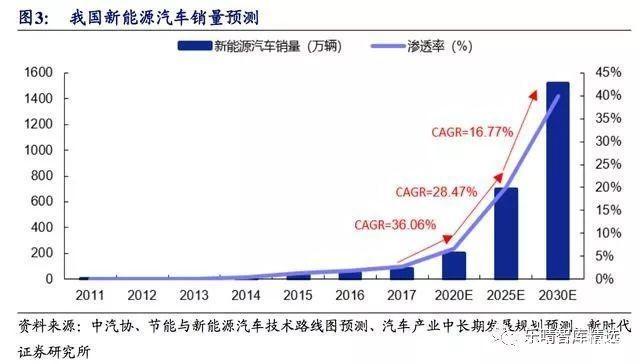 相對(duì)于我國(guó)傳統(tǒng)汽車每年接近3000萬(wàn)輛的銷售市場(chǎng),新能源汽車銷量滲透率不到3%,行業(yè)處于高速增長(zhǎng)的初期階段。