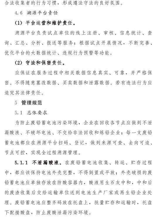 建立廢鉛蓄電池溯源管理平臺,探索廢鉛蓄電池全過程溯源管理模式,實(shí)行廢鉛蓄電池全過程線上信息跟蹤。鉛蓄電池生產(chǎn)企業(yè)、經(jīng)銷商、銷售網(wǎng)點(diǎn)、再生鉛企業(yè)及其回收體系、運(yùn)輸企業(yè)等參與廢鉛蓄電池回收的各責(zé)任主體,要在溯源管理平臺注冊登記。參與廢鉛蓄電池回收的各責(zé)任主體收到廢鉛蓄電池后及時粘貼二維碼、掃碼錄入信息,實(shí)現(xiàn)廢鉛蓄電池自產(chǎn)生至再生鉛企業(yè)來源可查、去向可追、全程可控的目標(biāo)。