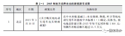 2015年,北京、河北、長春、山西等地陸續(xù)出臺了相關(guān)新能源車政策,紛紛響應(yīng)中央標(biāo)準(zhǔn)1:1配套補助新能源環(huán)衛(wèi)車,如表2-1所示。