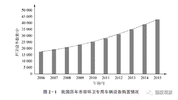 據(jù)國家統(tǒng)計局統(tǒng)計,截至2015年年底,我國城鎮(zhèn)化率已經(jīng)達(dá)到56.1%。且目前正以年均1個百分點的速度增長。2015年,全國市容環(huán)衛(wèi)專用車輛設(shè)備共42702臺,同比增加3789臺,如圖2-1所示。