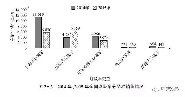 2015年我國垃圾車共完成銷售16386輛,同比下降24.03%。細(xì)分品種, 2015年壓縮式垃圾車?yán)塾嬩N量超過6300輛,同比增長55%以上,占2015年全國垃圾車總銷量超過38%,同比提升19%;自卸式垃圾車大幅下降,幅度超過49%,市場份額的下降超過17%;餐廚垃圾車實現(xiàn)快速增長,銷售459輛,同比增長194.23%,市場份額2.80%,同比提升2.08%;擺臂式垃圾車447輛,同比降低31.65%,市場份額2.73%。