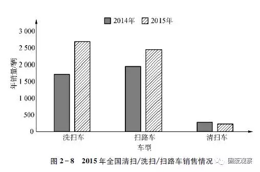 2015年,我國合計完成清掃車、洗掃車、掃路車銷售5386輛,同比增長36.01%。細(xì)分市場,洗掃車和掃路車?yán)塾嬩N量同比均實現(xiàn)增長,分別達(dá)到2700輛和2459輛,同比增幅分別在56%和25%以上,在2015年全國清掃/洗掃/掃路車總銷量中的占有率分別在50%和45%以上,同比分別增長6%和下降3%以上。