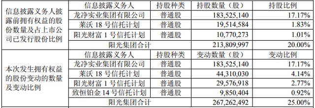 據(jù)了解,截至本公告日龍凈環(huán)保股東陽光集團(tuán)在上海證券交易所通過集中交易方式完成0.53億股的增持。權(quán)益變動前陽光集團(tuán)持股20%,權(quán)益變動后持股比例為25%。