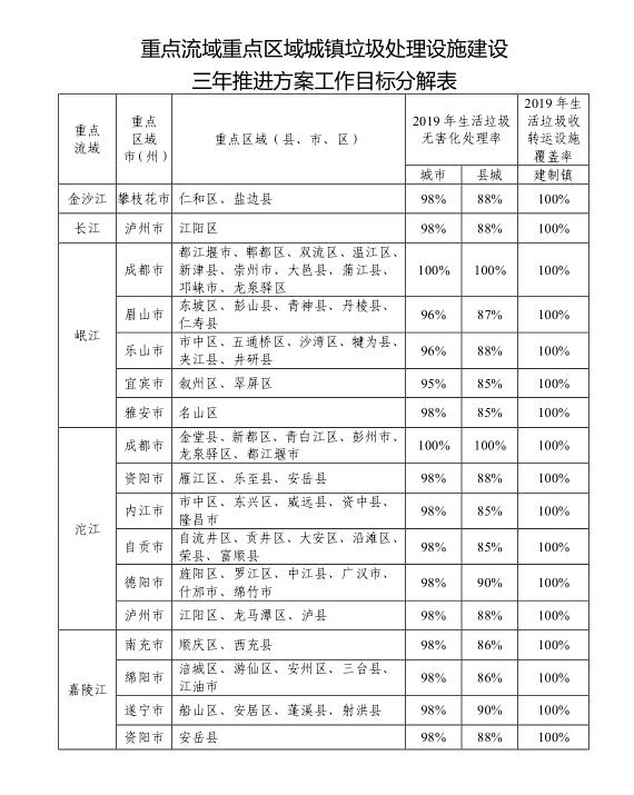 2017年4月,省政府辦公廳印發(fā)了《四川省城鎮(zhèn)污水處理設(shè)施建設(shè)三年推進(jìn)方案》和《四川省城鄉(xiāng)垃圾處理設(shè)施建設(shè)三年推進(jìn)方案》(川辦函〔2017〕85號,以下簡稱兩個(gè)三年推進(jìn)方案),各地按照兩個(gè)三年推進(jìn)方案,積極推進(jìn)城鎮(zhèn)污水和城鄉(xiāng)垃圾處理設(shè)施建設(shè),取得了積極成效。為加快推進(jìn)四川省城鎮(zhèn)污水和城鄉(xiāng)垃圾處理設(shè)施建設(shè),切實(shí)改善城鄉(xiāng)生態(tài)環(huán)境質(zhì)量,更好滿足人民群眾對美好環(huán)境的需求,省政府組織住房城鄉(xiāng)建設(shè)廳對兩個(gè)三年推進(jìn)方案作了修訂完善。經(jīng)省政府同意,現(xiàn)將修訂后的兩個(gè)三年推進(jìn)方案主要建設(shè)任務(wù)表、目標(biāo)任務(wù)表、重點(diǎn)流域重點(diǎn)區(qū)域目標(biāo)分解表及實(shí)施項(xiàng)目計(jì)劃表印發(fā)你們,并就有關(guān)事項(xiàng)通知如下。